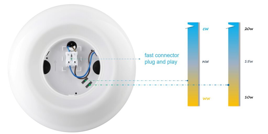 Fast connector plug and play,Toggle to adjust Color Temp. & Wattage